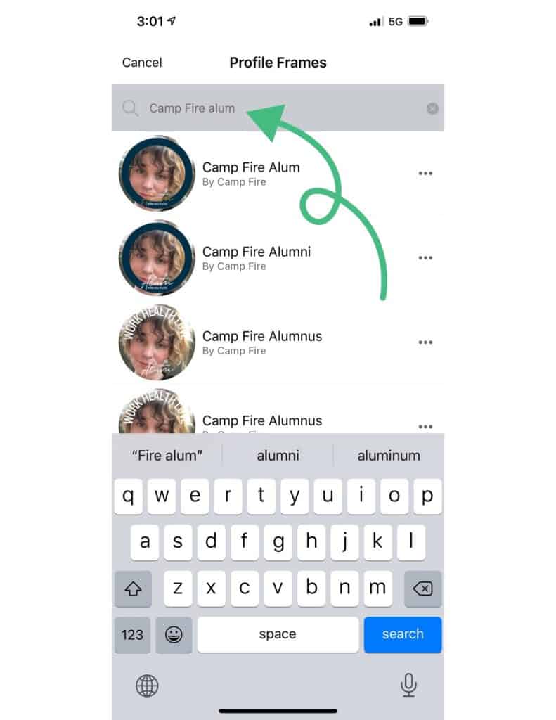 2. Search “Camp Fire Alum” to see the available frames.. Then. select ‘Add Frame”